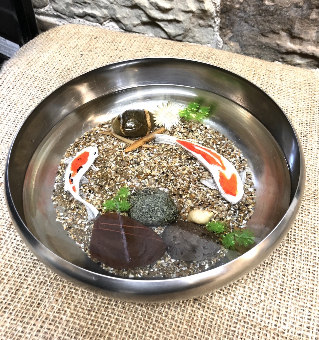 This is a stainless steel bowl depicting 2 x koi handpainted in acrylic between many layers of resin. 21cm bu 6 cm deep.